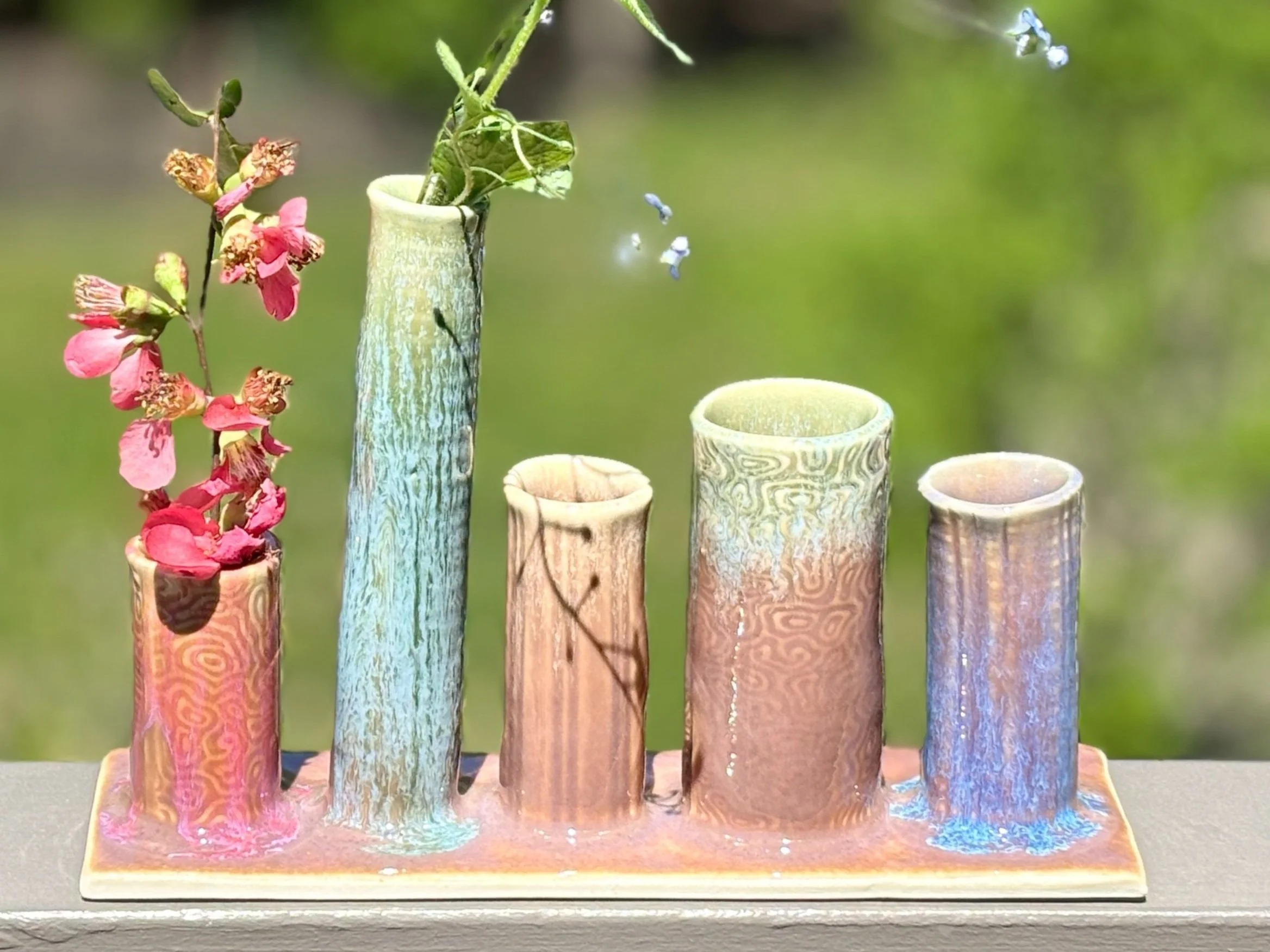 Design and build a charming set of bud vases perfect for displaying single stems or small floral arrangements. Using hand-building techniques, you’ll create a coordinated group of mini vases on a tray or base. Great for beginners and flower lovers alike! All materials and kiln firing included.
